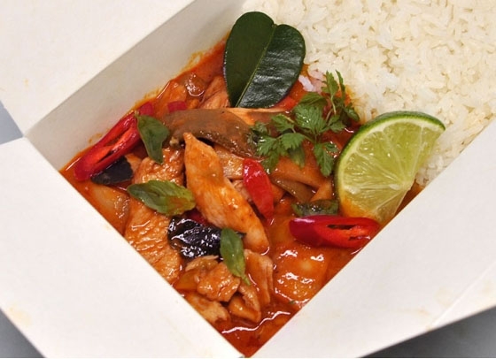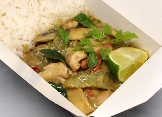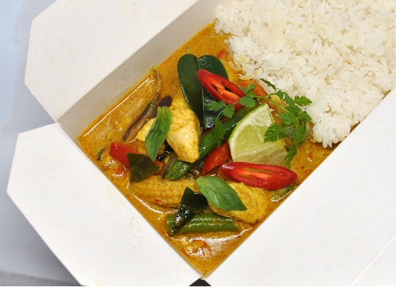Thai sárga curry csirkével, Jázmin rizs, Tom ka leves csirkével és rákkal, Mogyorós sült tészta, Sült szezám golyó kókuszos-karamell öntettel,